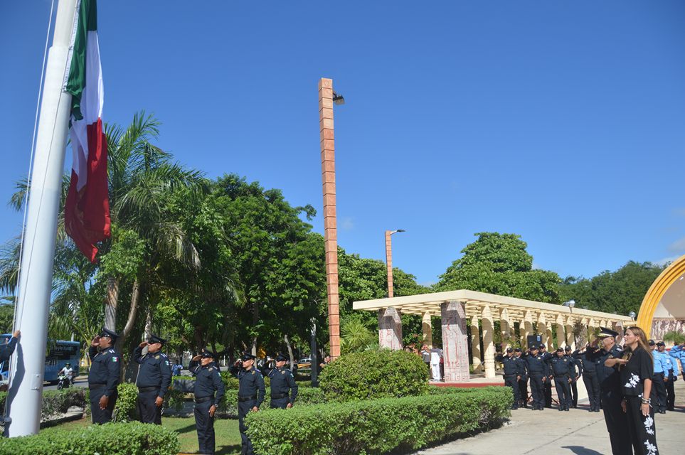 Con la participación de elementos de la Policía Municipal se elevó el Lábaro Patrio hasta lo más alto del asta para luego cantar el Himno Nacional teniendo como escenario la emblemática Concha Acústica con su Art Decó Neo-Maya.