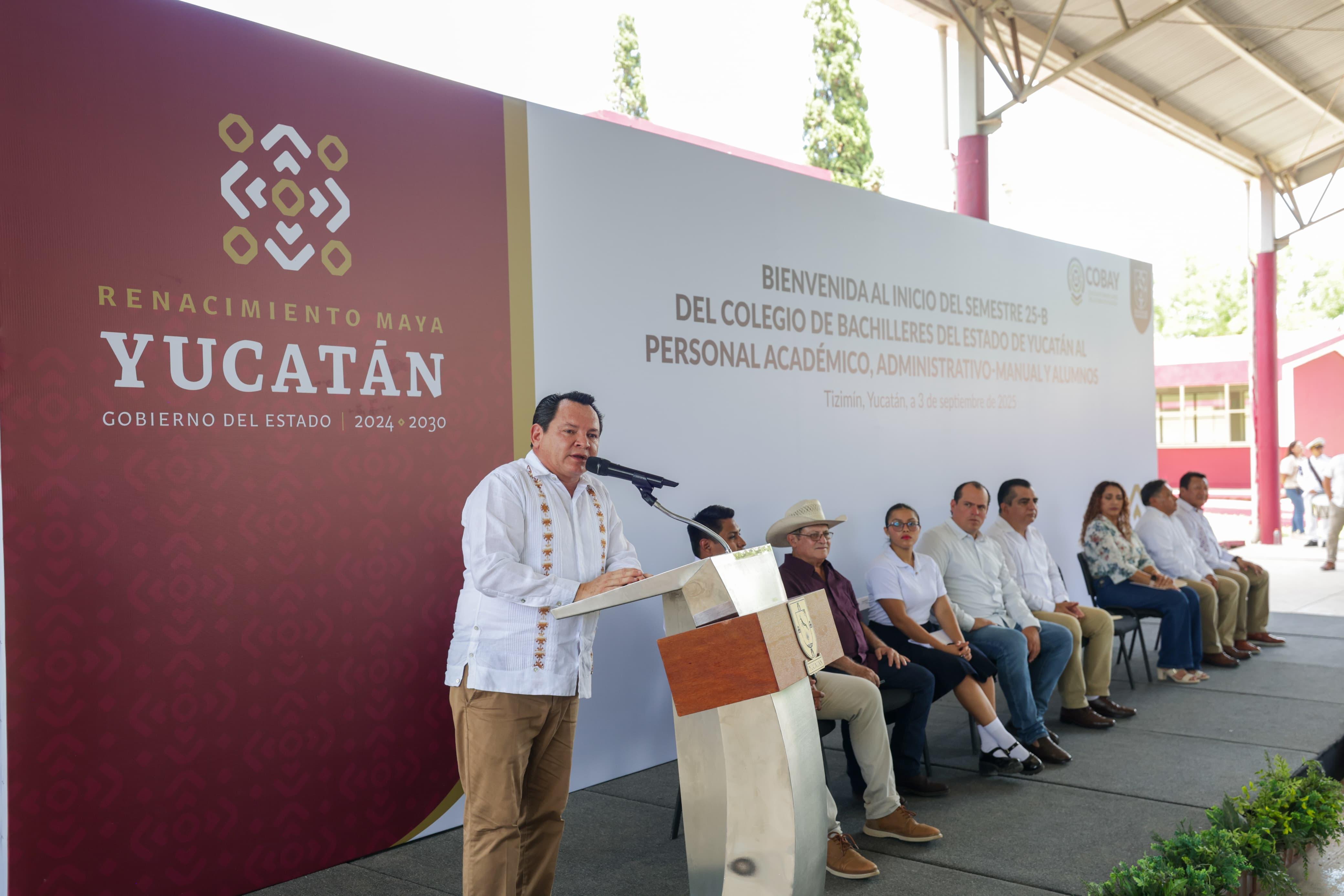 Al encabezar el inicio del semestre 2025-B del Colegio de Bachilleres de Yucatán (Cobay), el Gobernador Joaquín Díaz Mena anunció una serie de mejoras para el plantel de Tizimín, que incluyen la rehabilitación del laboratorio de química, el equipamiento del salón de cómputo y la construcción, para 2026, de una cancha de fut-7.