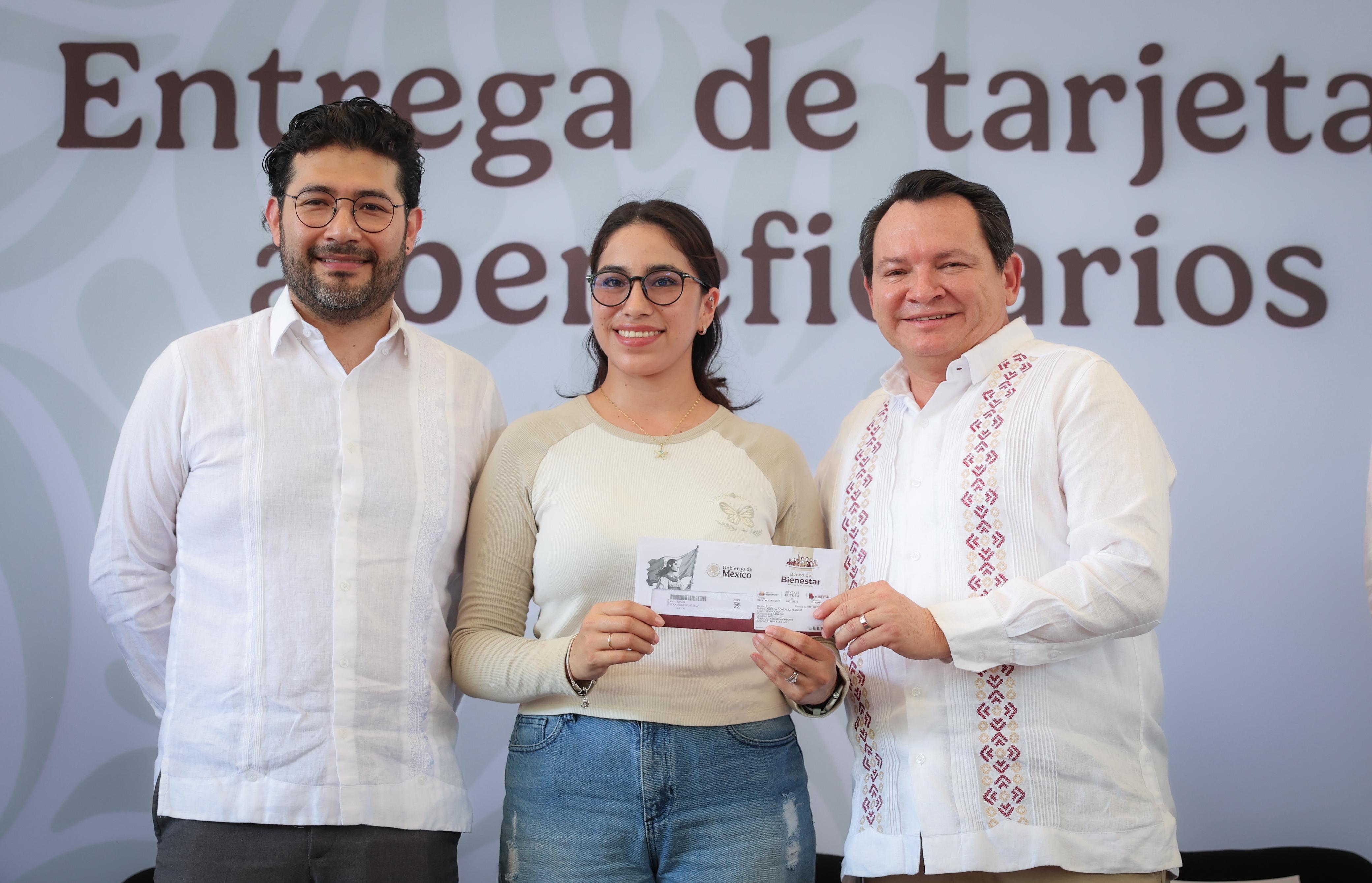 Con la entrega de tarjetas del programa federal Jóvenes Construyendo el Futuro, encabezada por el Gobernador Joaquín Díaz Mena y el Secretario del Trabajo y Previsión Social del Gobierno de México, Marath Baruch Bolaños López, inició en Yucatán el proceso mediante el cual las y los beneficiarios recibirán un apoyo mensual de 8,480 pesos durante un año, con el propósito de capacitarse en centros de trabajo y adquirir experiencia laboral que facilite su inserción en el mercado o el emprendimiento de nuevos proyectos.